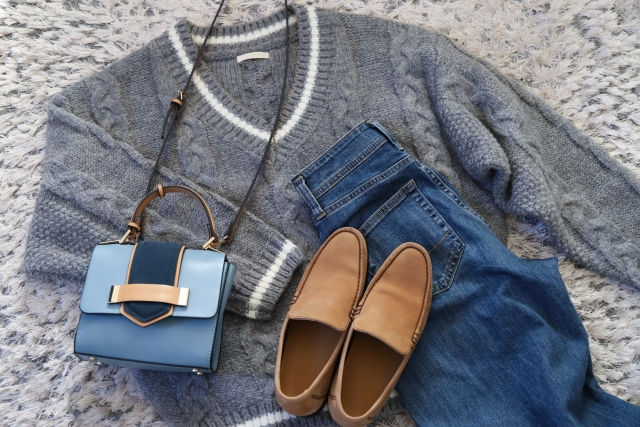 プレッピーなVネックニットやカーディガンは、レイヤードコーデでおしゃれ上級者をめざしましょう。